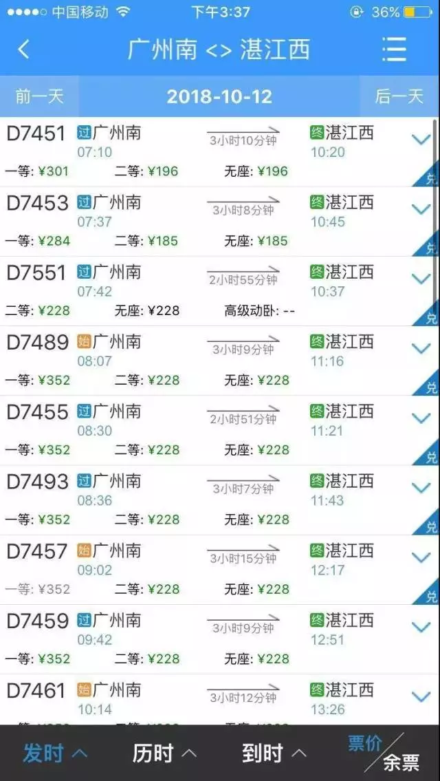 D7453次(7點37分班次)由原來的228元調整為185元;