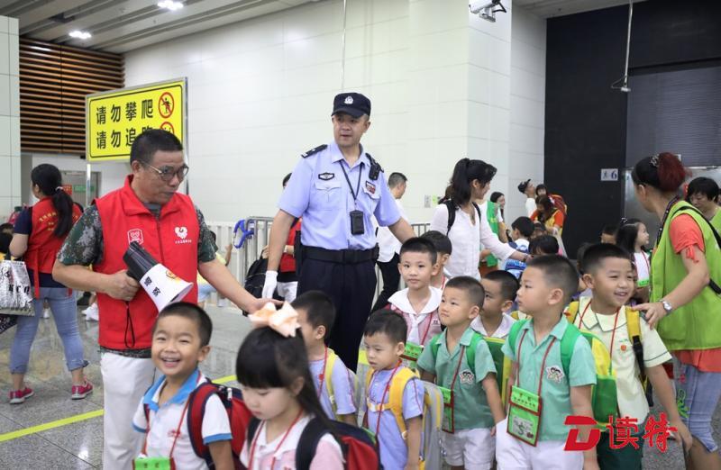 邊檢民警與深圳義工在福田口岸出境大廳悉心呵護跨境學(xué)童安全快捷通關(guān)。黃俊生攝