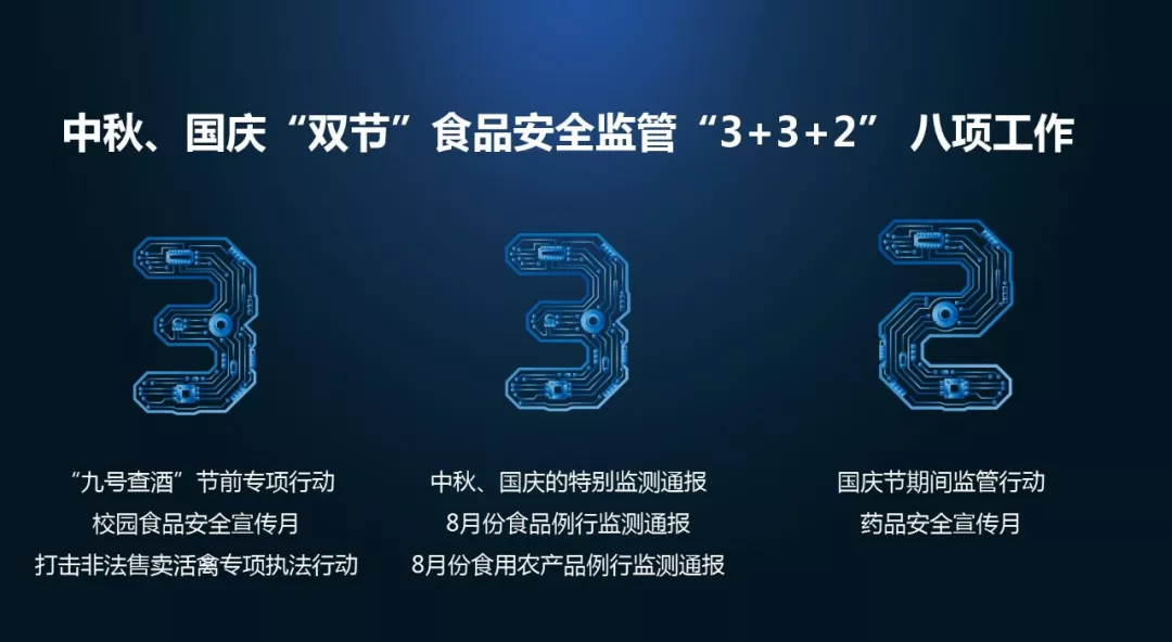 發(fā)布會對中秋、國慶“雙節(jié)”食品安全監(jiān)管“3+3+2”共八項工作進行發(fā)布: