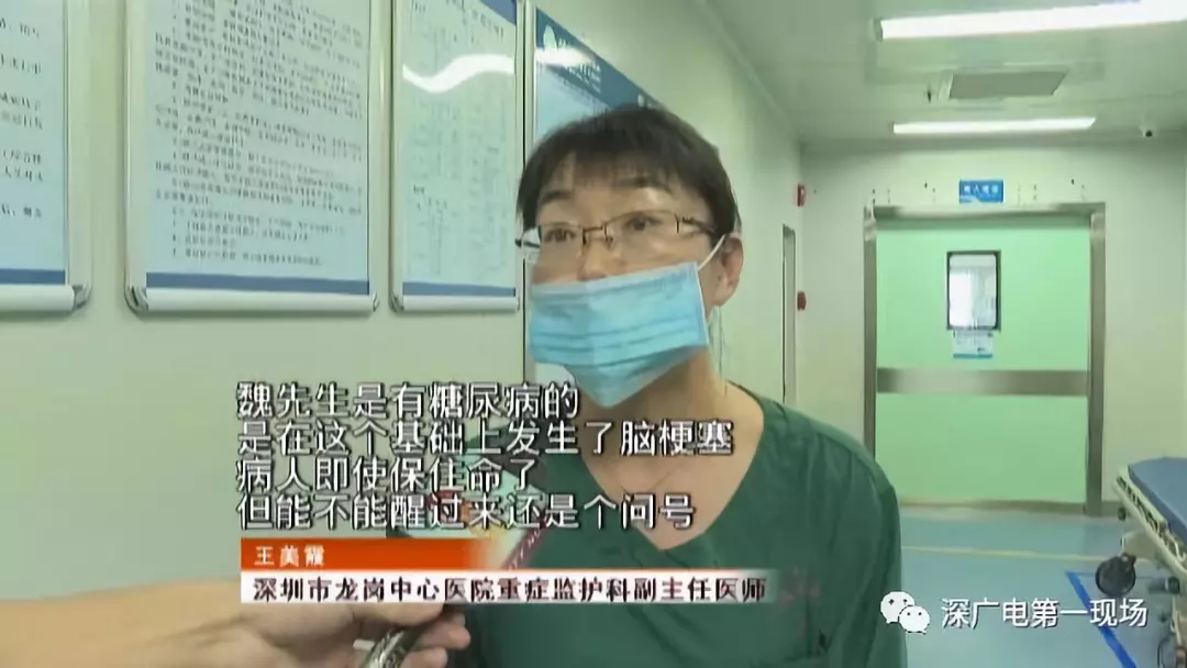 蕭先生介紹,魏師傅從一開始的清醒到病情加重,只有前后十幾分鐘的時間。等120救護(hù)車送到龍崗中心醫(yī)院之后,魏師傅已經(jīng)陷入昏迷,不省人事。