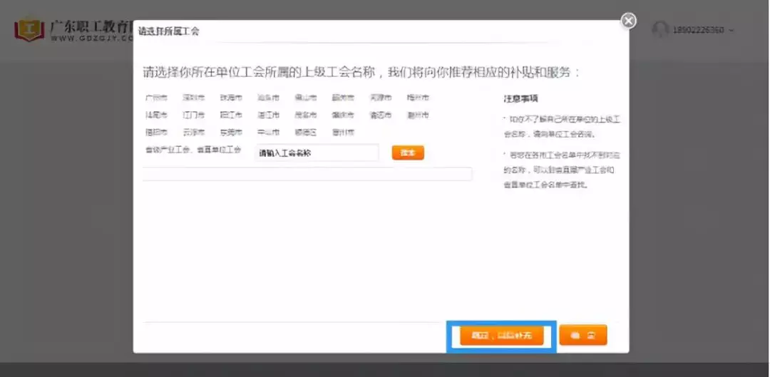 1.進(jìn)入個(gè)人中心頁面,系統(tǒng)自動(dòng)彈出工會(huì)所屬窗口,選擇所屬工會(huì),如仍未確定所屬工會(huì),可點(diǎn)擊【跳過,以后補(bǔ)充】;如已確定所屬工會(huì),請(qǐng)選擇所屬工會(huì),點(diǎn)擊【確定】;