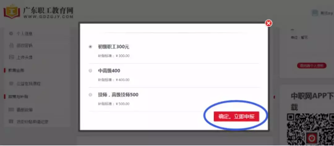 在網(wǎng)站(www.gdzgjy.com)首頁左側(cè)【申報(bào)與補(bǔ)貼申領(lǐng)入口】,點(diǎn)擊“廣東省總工會(huì)產(chǎn)業(yè)工人大培訓(xùn)學(xué)歷、職業(yè)補(bǔ)貼申領(lǐng)”界面,選擇右側(cè)“職業(yè)技能提升補(bǔ)助”點(diǎn)擊【進(jìn)入申領(lǐng)】。
