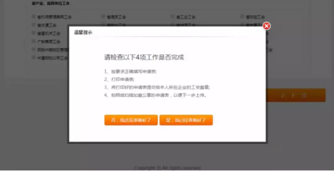 2.根據(jù)“溫馨提示”確認(rèn)是否已完成,如果未完成,點(diǎn)擊【否,我還沒準(zhǔn)備好】,并隨后完成所有工作;如果已完成,點(diǎn)擊【是,我已經(jīng)準(zhǔn)備好了】,進(jìn)入下一個(gè)頁面。在申報(bào)過程中,長(zhǎng)時(shí)間在網(wǎng)站頁面停留,會(huì)遇到頁面過期,遇到此問題需重新登錄;