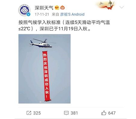 雖然深圳積極嘗試了入秋,但這場(chǎng)弱冷空氣并不妨礙深圳入秋失敗!因?yàn)榘礆夂驅(qū)W劃分標(biāo)準(zhǔn):以5天滑動(dòng)平均氣溫穩(wěn)定 ,22 ℃才是秋季的開(kāi)始。深圳平均入秋時(shí)間在11月3日,去年更是在11月19日才入秋成功。
