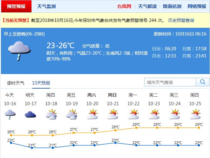 深圳市氣象局提醒,16日 ~17日陰天有雨,雨天路面濕滑能見度差,對交通影響較大,需注意防范降雨對上班高峰期帶來的不利影響。預計17日重陽節(jié)早晨仍有分散小雨,路面濕滑,戶外登高要注意防滑保暖。
