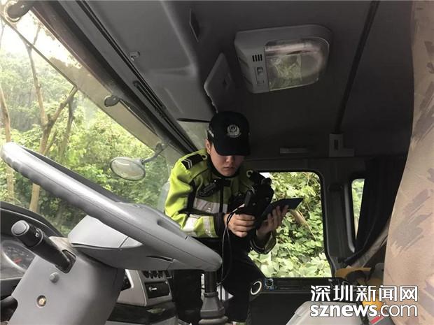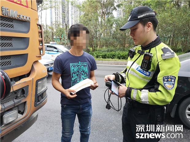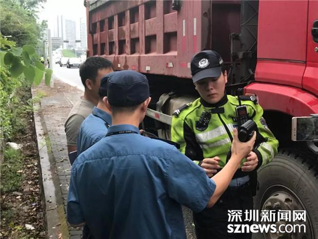 深圳交警民警檢查泥頭車(chē)駕駛員的相關(guān)證件