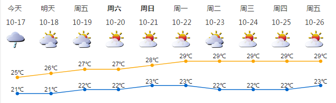 我市陰天間多云,有小雨;氣溫21-26℃;東北風2-3級;相對濕度70%-95%