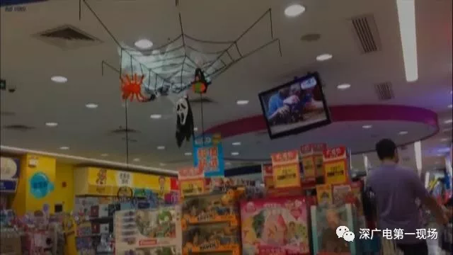 溜冰場工作人員:“就是萬圣節(jié)鬼節(jié)嘛,掛這些東西小孩們可開心了,還有小孩爬上去拽那些玩意,不會(huì)嚇到的,來滑冰的顧客臉上都會(huì)化妝扮鬼?!?/p> 玩具賣場萬圣節(jié)道具花樣多 魔鬼面具熱銷