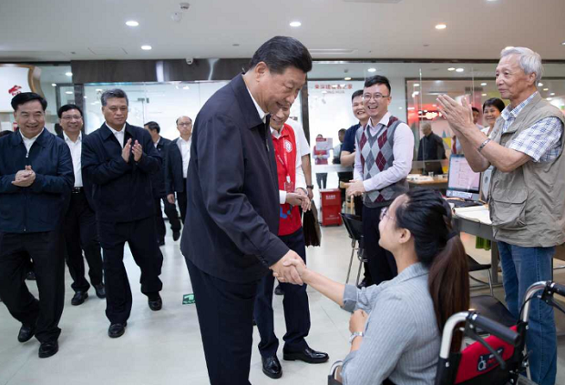 24日上午,社區(qū)居民張瑩瑩正在社區(qū)圖書館查閱資料,習(xí)近平總書記向她走來,與她親切交流。張瑩瑩5歲的時候因為小兒麻痹癥落下了腿疾,行動不便。她告訴總書記,社區(qū)有300多名殘疾人士,這里有專門為殘疾居民設(shè)計的戶型。