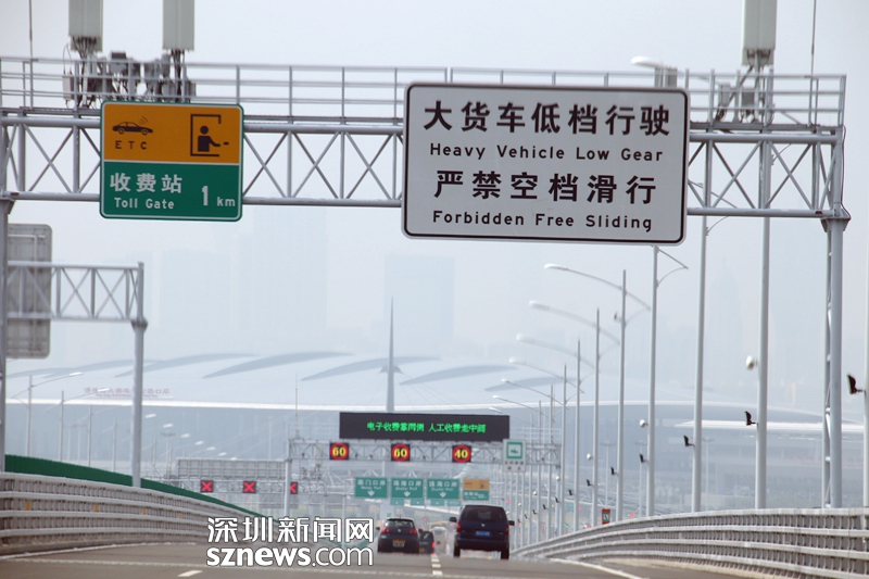 距離珠海收費站還有1公里,這里是一段下坡,指示牌提醒嚴禁空檔滑行