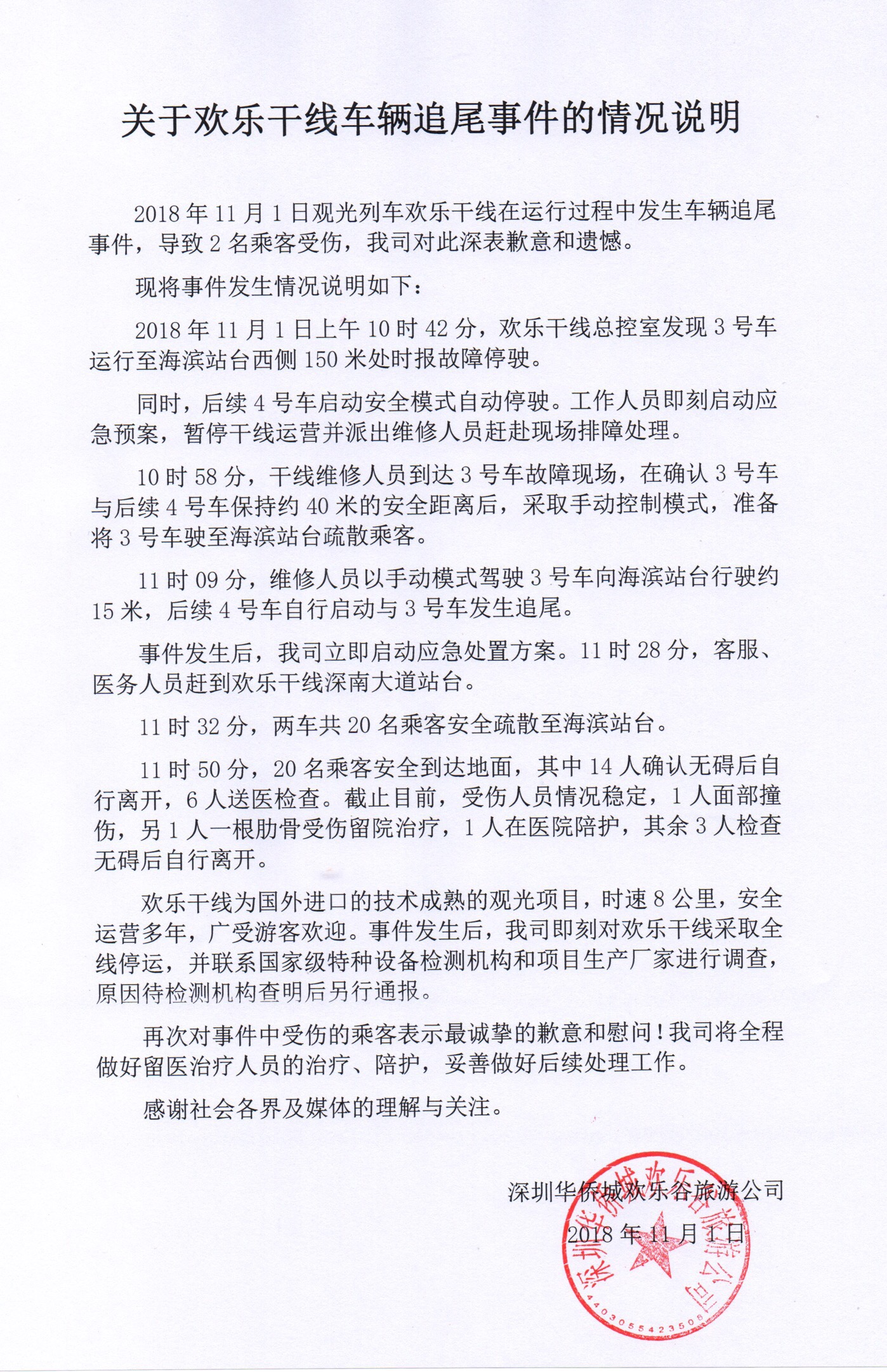 11月1日19時(shí),歡樂(lè)谷旅游公司發(fā)布追尾事件情況說(shuō)明,并向受傷乘客表示歉意。目前歡樂(lè)干線已全線停運(yùn)。