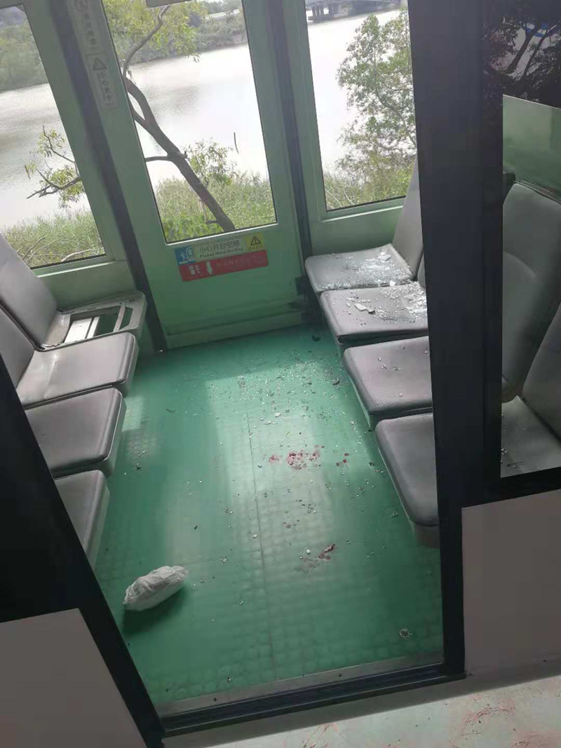 記者從歡樂(lè)干線觀光車(chē)上一位乘客拍攝的視頻中看到,這次撞擊將車(chē)身玻璃撞碎,玻璃渣掉落一地,中間還摻雜了血跡。坐在其中一列車(chē)上的乘客驚魂未定??陕?tīng)到乘客在交流:“你撞到了嗎?”“我撞到膝蓋了?!痹谝曨l中,記者還看到有一人站在兩節(jié)列車(chē)中間,看似正在檢查車(chē)輛情況,像是工作人員,他說(shuō):“我也沒(méi)想到這個(gè)會(huì)撞上來(lái)?!?/p>
