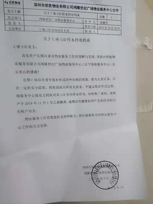 10月30日鴻隆世紀(jì)廣場物業(yè)服務(wù)中心物業(yè)發(fā)出關(guān)于 C座11D停水停電函,表示 C座存在青年旅社形式對(duì)外出租的現(xiàn)象,室內(nèi)人員居多,存在安全隱患,按桂園派出所有關(guān)要求,不建議旅社形式出租。業(yè)主授權(quán)物業(yè)中心對(duì)11D進(jìn)行室內(nèi)停水停電,協(xié)助租戶離場,并要求租戶于11月1日之前搬離。