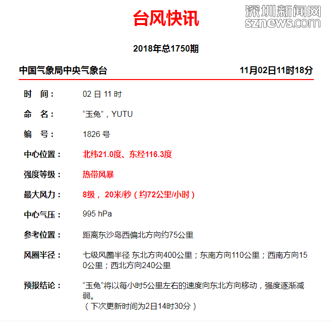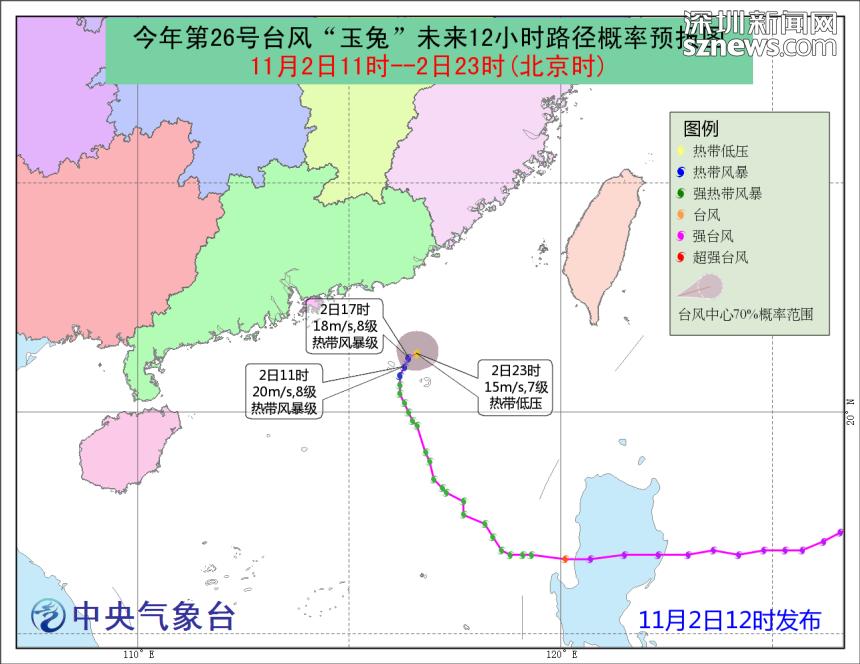 記者從深圳市氣象臺獲悉,臺風“玉兔”(強熱帶風暴級),1日14時距離深圳約372公里,中心附近最大風力11級(30米/秒),預計“玉兔”將以每小時7公里左右的速度向偏北方向移動,2日上午距離深圳市最近約300公里,強度明顯減弱,較大可能于2-3日在南海東北部減弱消失。