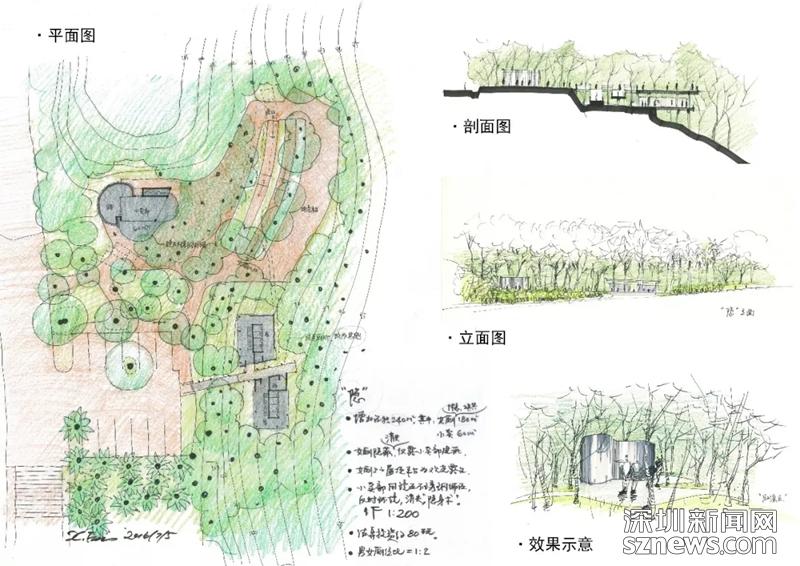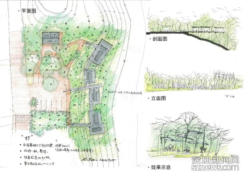 費曉華在文中提到,“隨著深圳人口和游客的劇增,蓮花山頂公共廁所已不堪負重,急需擴大規(guī)模。2016年,本人受蓮花山公園管理處的邀請,免費為他們提供了改擴建方案。方案共有兩種思路:‘隱擴’和‘顯擴’,均是在保留原建筑的基礎(chǔ)上,擴大使用面積以滿足更多人的需求。從更好地保護自然環(huán)境的角度出發(fā),本人推薦‘隱擴’方案?!?(附設(shè)計圖)