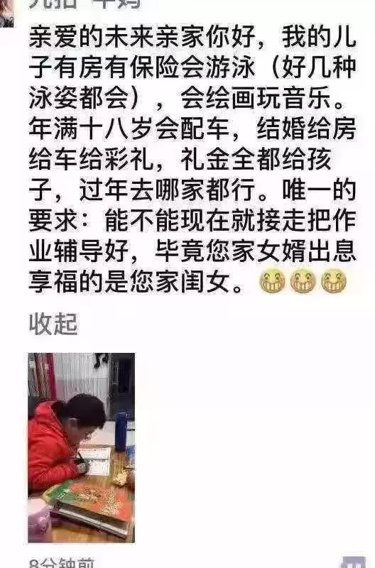 這兩天刷爆朋友圈的一種特殊的文體在朋友圈火了起來,這些文章都是寫給未來的親家的,文章開頭先是對(duì)自家娃大力夸獎(jiǎng)一番,什么有房有車、會(huì)游泳、婚禮豪配等要素,一個(gè)都不落下;文章的最后提出唯一的要求,那就是把娃現(xiàn)在就接走。這些文章充分顯示了家長在輔導(dǎo)自己孩子做作業(yè)的時(shí)候,心情不太舒暢。