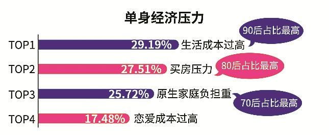 脫單難點中的經(jīng)濟壓力層面分析發(fā)現(xiàn),生活成本過高是影響脫單的最大單身壓力,其次是買房壓力,原生家庭負擔重以及戀愛成本過高。