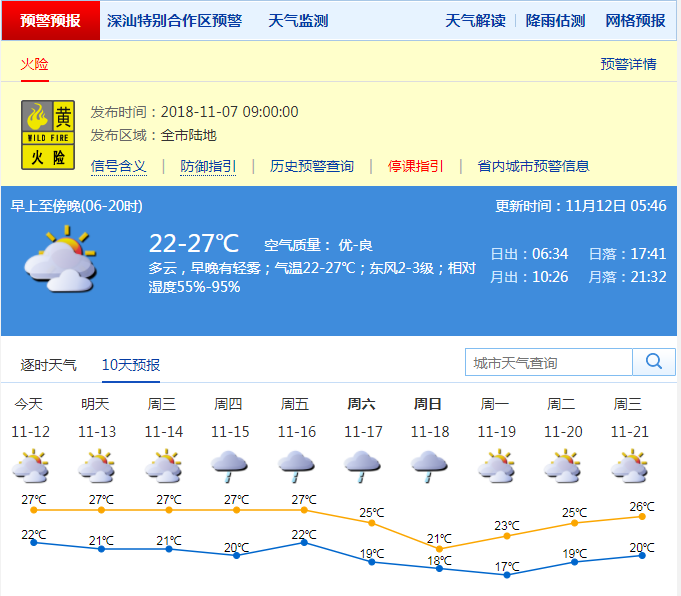 12日陰天間多云,早晚有輕霧和輕微霾,氣溫22-27 ℃;周二(13日)多云,可見陽光,氣溫略升;周三到周六(14-17日)陰天間多云,間中有零星小雨,雨時能見度較低,氣溫小幅波動;周日(18日)陰天有短時小雨,氣溫下降,北風加大。