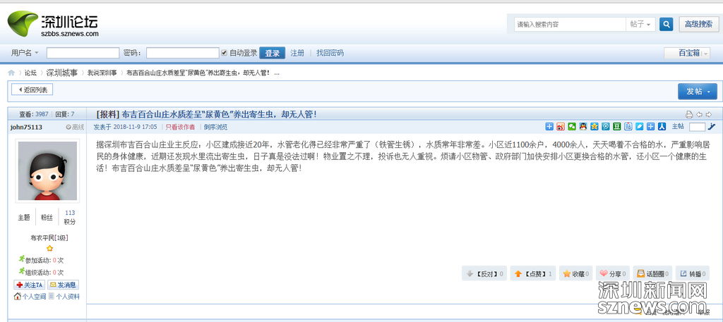 深圳新聞網(wǎng)11月12日訊 (記者劉婷)“布吉百合山莊水質(zhì)差呈‘尿黃色’養(yǎng)出寄生蟲(chóng),卻無(wú)人管!”,近日網(wǎng)友在深圳論壇上發(fā)帖曝料龍崗布吉百合山莊水質(zhì)差,引發(fā)網(wǎng)友廣泛關(guān)注。(網(wǎng)帖地址:https://szbbs.sznews.com/thread-3817358-1-1.html)