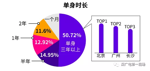 針對單身時長的調(diào)查發(fā)現(xiàn),有高達50.72%的人為單身三年以上的“長單族”,“長單族”占比最多的城市前三為北京、廣州和長沙。