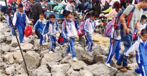 成群的學(xué)生在碎石上走過,旁邊小道擠滿三輪、電動(dòng)單車(網(wǎng)友“伊戈達(dá)拉”供圖