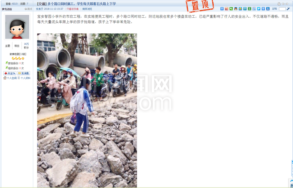 深圳新聞網(wǎng)11月14日訊(記者劉婷)“多個(gè)路口同時(shí)施工,學(xué)生每天踩著石頭路上下學(xué),這也太危險(xiǎn)了呀!”13日,網(wǎng)友“伊戈達(dá)拉”在深圳論壇上發(fā)帖稱,寶安智園小學(xué)外多個(gè)路口同時(shí)動(dòng)工,加上附近地段多個(gè)樓盤在動(dòng)工,導(dǎo)致學(xué)生上學(xué)路被挖得面目全非,嚴(yán)重影響出行安全。(網(wǎng)帖:https://szbbs.sznews.com/thread-3819007-1-1.html