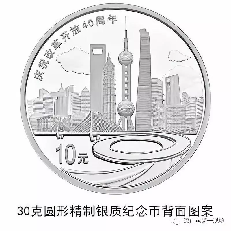 30克圓形銀質(zhì)紀念幣背面圖案之三為上海浦東標(biāo)志性建筑及南浦大橋、黃浦江等組合設(shè)計,并刊“慶祝改革開放40周年”字樣及面額。