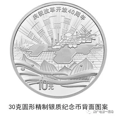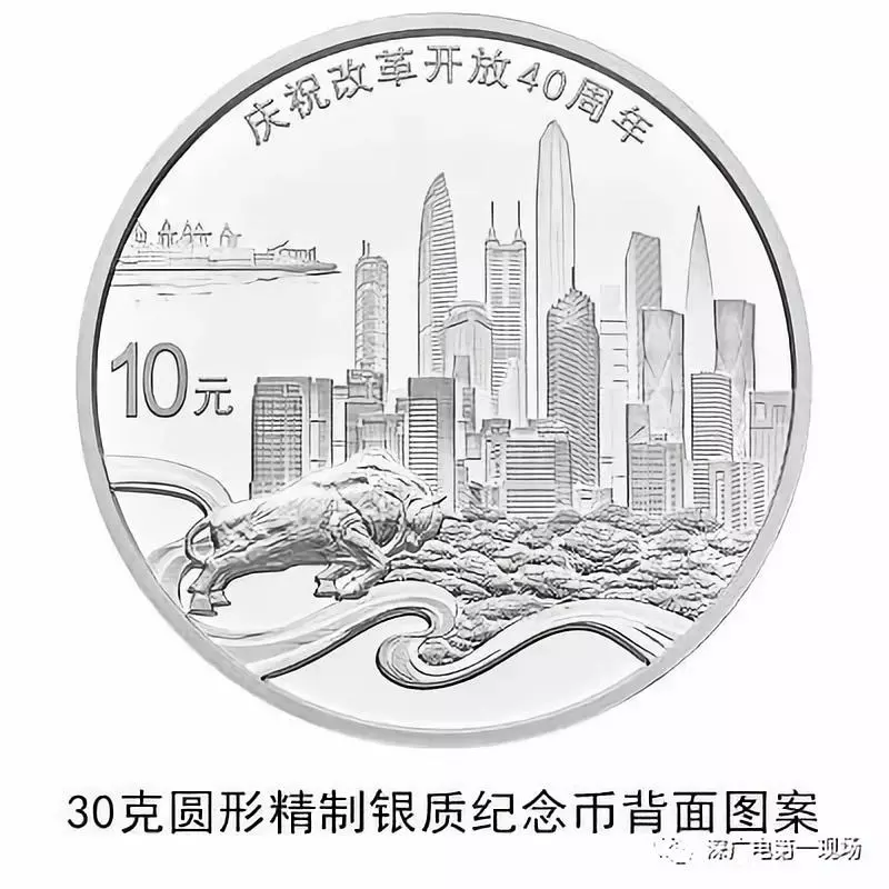 30克圓形銀質(zhì)紀念幣背面圖案之二為深圳城市建筑、蛇口港、拓荒牛雕塑及飄帶等組合設(shè)計,并刊“慶祝改革開放40周年”字樣及面額。