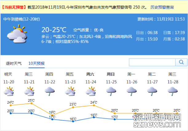 市氣象局預(yù)計(jì),11月20-21日,深圳市以多云間陰天為主,部分時(shí)間有零星小雨; 22日受冷空氣影響,有小雨,北風(fēng)加大,氣溫下降,天氣轉(zhuǎn)涼,日溫差小。23-24日,以多云天氣為主,可見陽(yáng)光,早晚清涼。
