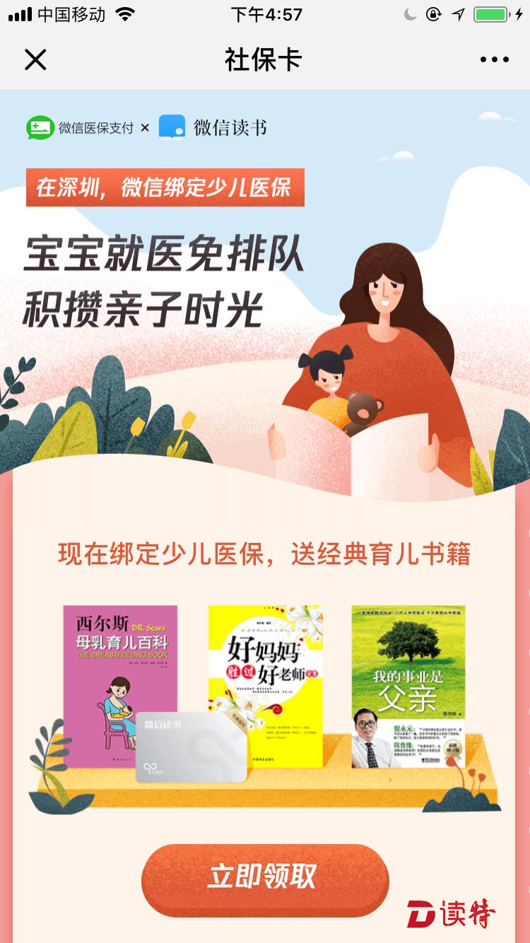 深圳特區(qū)報(bào)2018年11月21日訊 作為微信醫(yī)保支付的試點(diǎn)城市,深圳又開通便民新服務(wù),全國內(nèi)率先開通微信綁定少兒社???,支持少兒醫(yī)保線上支付服務(wù)。記者獲悉,11月20日起,父母在微信綁定孩子的少兒社??ǎ涂梢杂梦⑿派贤ㄟ^醫(yī)保給孩子繳納掛號、就診費(fèi)用,省去排隊(duì)煩惱。此外,20日起,用戶在微信綁定少兒社???,可免費(fèi)領(lǐng)取微信讀書三本經(jīng)典育兒書籍和3天無限閱讀卡兌換碼。