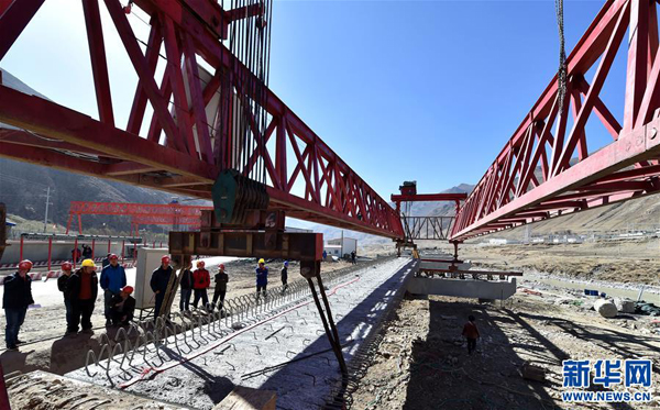 中鐵大橋局工作人員在拉薩至那曲高等級公路昂嘎大橋施工現(xiàn)場作業(yè)。新華社記者覺果 攝