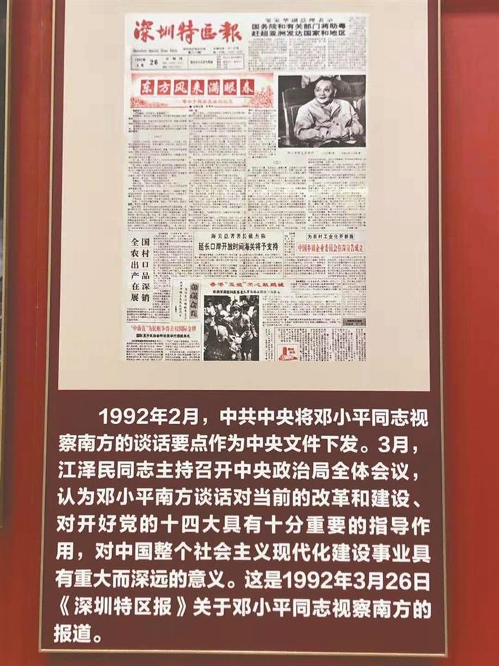 ▲展覽展出的1992年3月26日刊登長篇通訊《東方風(fēng)來滿眼春》的《深圳特區(qū)報(bào)》頭版圖片。