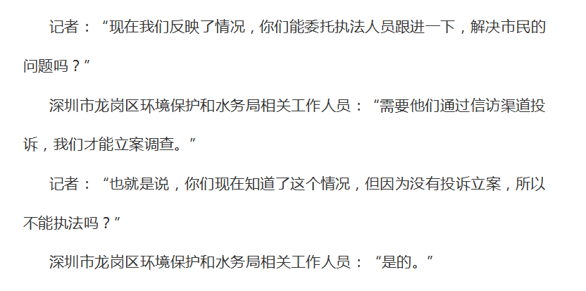 以下是記者與深圳市龍崗區(qū)環(huán)境保護(hù)和水務(wù)局信訪(fǎng)部門(mén)工作人員的部分對(duì)話(huà):