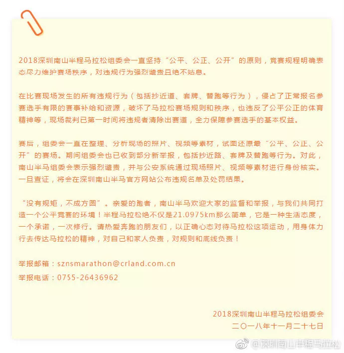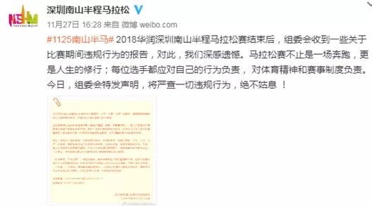 https://mp.weixin.qq.com/s/xge5TY29hk9IjLRMCAG43w希望廣大跑者遵守賽事規(guī)程,尊重其他正常參賽的跑者,尊重體育精神,自覺維護(hù)賽場秩序;深圳南山半程馬拉松組委會將在今后賽事中加強(qiáng)賽事監(jiān)督管理并融入技術(shù)手段,以跑者體驗至上,共同營造健康、公正、公平的馬拉松參賽環(huán)境。