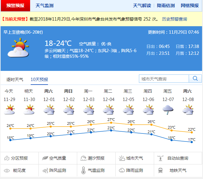 11月29日深圳最高氣溫24°,多云間晴天;氣溫18-24℃;東風2-3級,陣風5-6級;相對濕度65%-95%