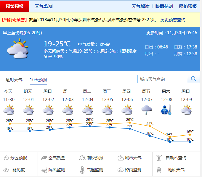 深圳新聞網(wǎng)11月30日訊(記者 施冰冰)29日多云間晴天;18-25℃;東風2-3級;濕度50%-90%。12月1-2日多云可見陽光,早晚有輕霧;3-6日多云間陰天,偶有零星小雨。展望7-8日,受冷空氣影響,北風明顯增大,天氣轉冷。