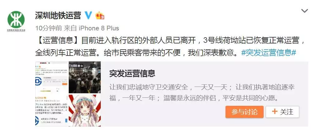 而據(jù)@深圳地鐵運(yùn)營(yíng)19點(diǎn)44分消息稱,3號(hào)線荷坳站已恢復(fù)正常運(yùn)營(yíng),全線列車正常運(yùn)營(yíng)。