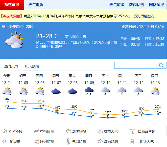 深圳新聞網(wǎng)12月4日訊(記者 劉婷)記者從市氣象臺(tái)獲悉,預(yù)計(jì)今日多云,午后云量增多,早晚有輕霧,氣溫21℃至28℃;5日至6日陰天間多云,間有零星小雨。預(yù)計(jì)7日起冷空氣活動(dòng)頻繁,北風(fēng)加大,7日至8日陰天有分散小雨,氣溫下降,最低氣溫或低至14℃。