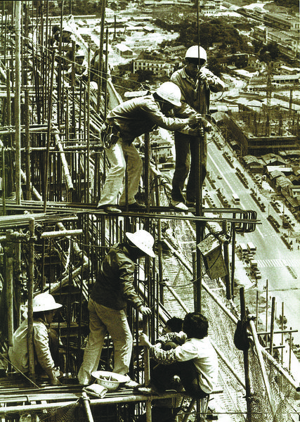 1984年,創(chuàng)造“三天一層樓”的“深圳速度”的國(guó)貿(mào)大廈工人。江式高 攝