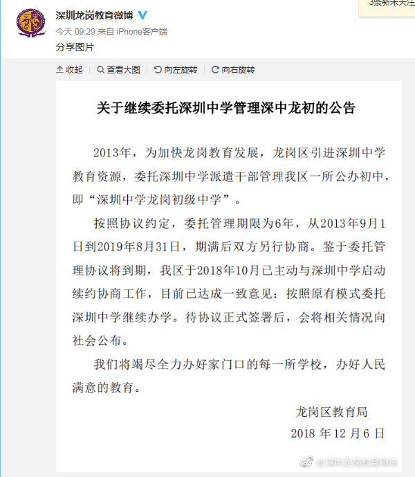 據(jù)了解,從11月底開始,深圳中學(xué)將撤離龍崗的消息就在網(wǎng)絡(luò)上不脛而走,學(xué)區(qū)內(nèi)的業(yè)主在得知這個消息后,有些不知所措,紛紛通過各種渠道打聽消息,有些業(yè)主直接找到龍崗區(qū)教育局求證。12月6日,深圳龍崗教育官方微博發(fā)布公告,目前已達成一致意見:按照原有模式委托深圳中學(xué)繼續(xù)辦學(xué)。