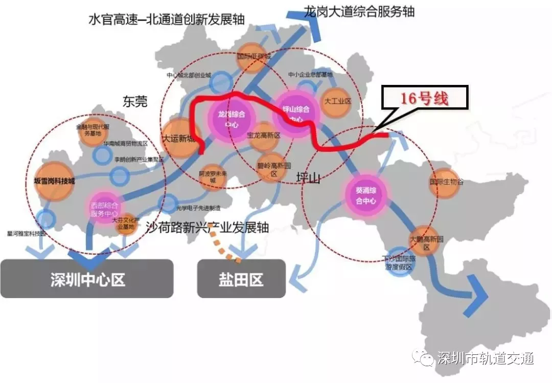 深圳地鐵16號線聯(lián)系大運新城、龍崗中心城、坪山站及坪山新區(qū)等地區(qū),是東部組團(tuán)內(nèi)部的軌道線路。線路全長約29.2公里,設(shè)站24座。線路由大運站引出,沿龍崗大道、黃閣路、龍平路敷設(shè),經(jīng)龍崗老中心后沿深汕公路往南至坪山站,經(jīng)坪山中心區(qū)后沿東縱路、金田路等路敷設(shè)至終點田心。