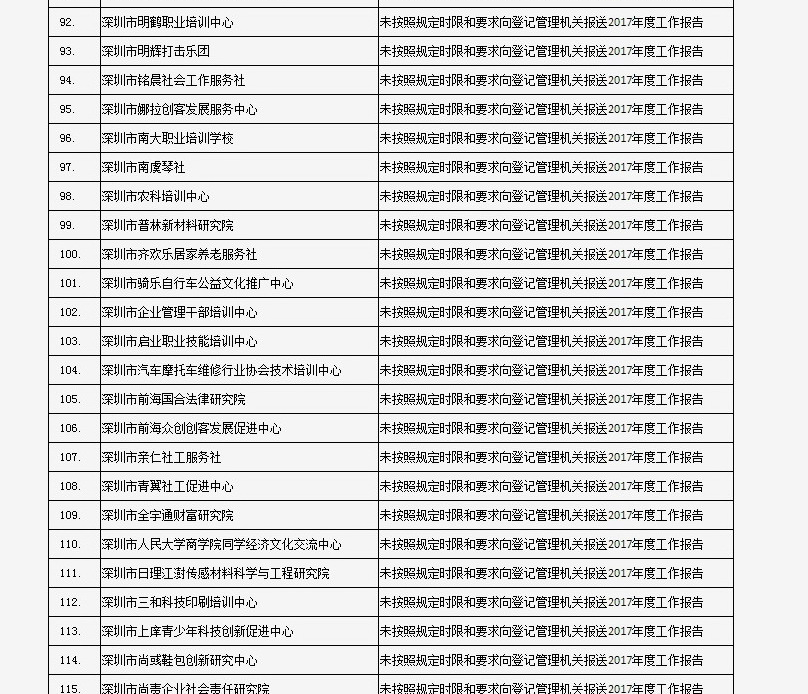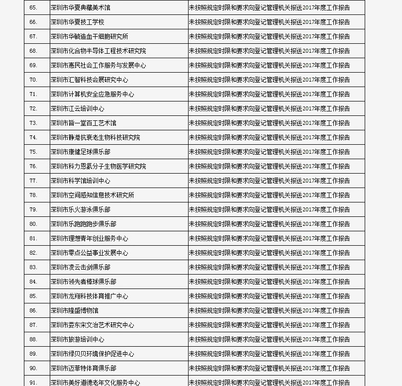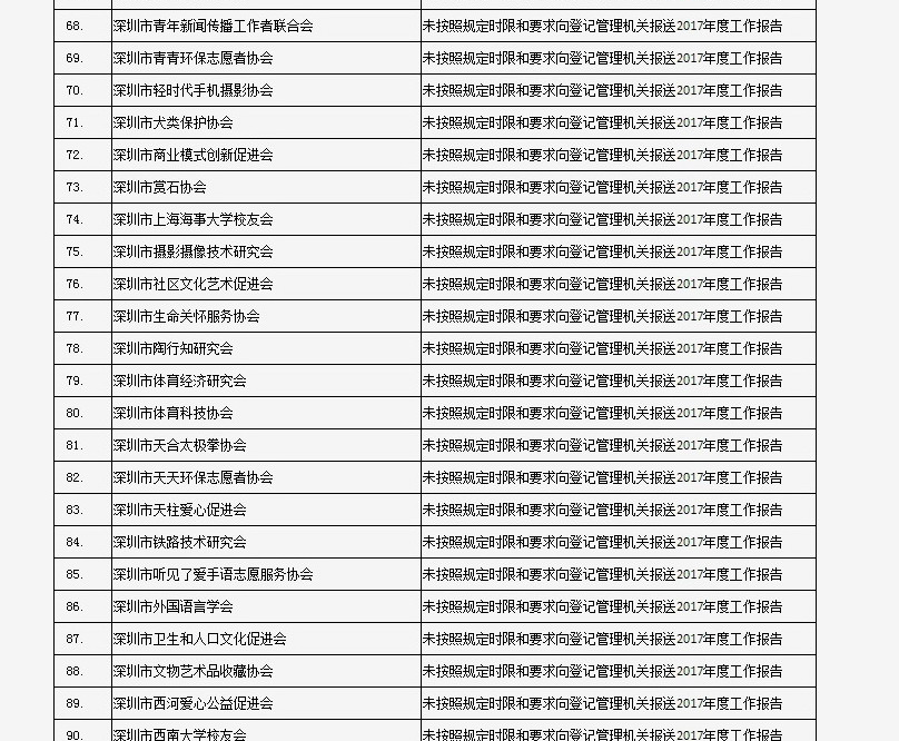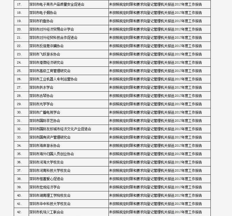 據(jù)深圳市民政局通報,深圳市華中科技大學(xué)校友會和深圳市深圳大學(xué)校友會等121家社會團體、深圳市郴州商會等75家行業(yè)協(xié)會商會、企業(yè)家與企業(yè)管理研究院(中國·深圳)等201家民辦非企業(yè)單位、深圳市明園慈善基金會等20家基金會,經(jīng)查“未按照規(guī)定時限和要求向登記管理機關(guān)報送2017年度工作報告”,違反了《社會組織信用信息管理辦法》《深圳經(jīng)濟特區(qū)行業(yè)協(xié)會條例》的相關(guān)規(guī)定,被列入活動異常名錄名單。完整版名單已在“深圳民政在線”公布。