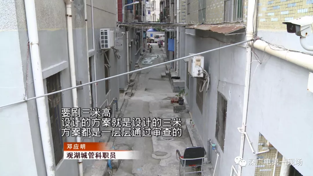 這里是龍華區(qū)觀湖街道辦福樓村里的城中村,這些居民樓的小巷子里,在這兩天來,有不少施工人員正在這里粉刷外墻。現(xiàn)場施工人員說,他們只刷房子的底下一層。
