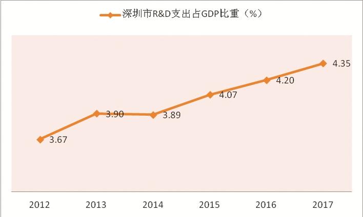 2012-2017年深圳市R&D支出占GDP比重變化。