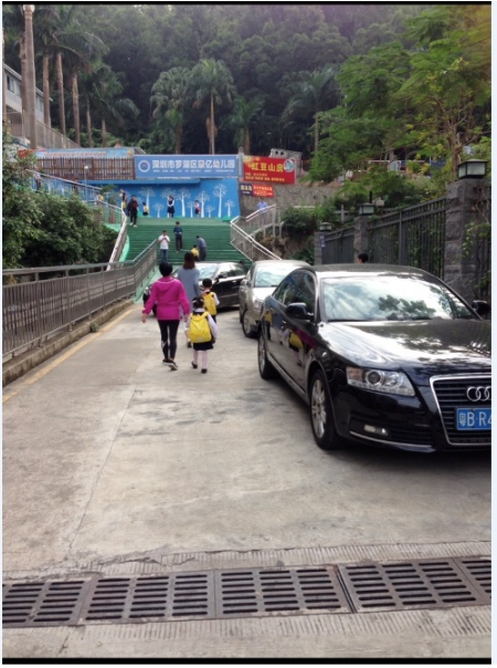 據(jù)該網(wǎng)友反映,通往景億幼兒園大門的道路只有上述提及的那兩條車道,一條被用來停車,而另一條則滿是排隊(duì)從景億山莊車庫轉(zhuǎn)彎出來的機(jī)動車?!岸紱]有路可以走了”該網(wǎng)友在帖文中表示,小孩和來接送的家長只能從機(jī)動車之間穿過,太不安全了。隨后,該網(wǎng)友還質(zhì)疑:事關(guān)3-5歲幼兒生命安全,為什么沒人管?