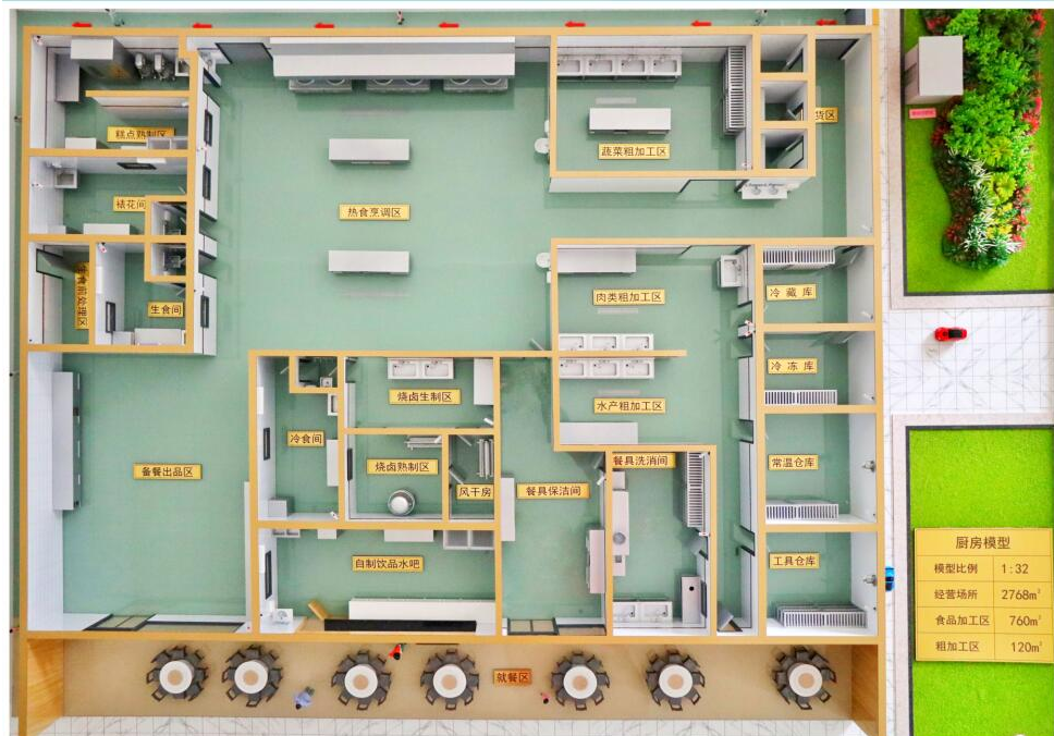 陳建華表示,“標準廚房沙盤模型”有五個特點:首先,經(jīng)營項目模塊化集成,集成了大中型餐館常見的五個經(jīng)營項目,包括熱食類、冷食類、糕點類、生食類食品和自制飲品,可以模塊化地組合和拆分。其次,布局完全達標,加工場所流程布局和設(shè)備設(shè)施布置完全符合審查標準的要求。再次,專間和專用場所完全合規(guī),全部按照國家食品經(jīng)營許可審查通則的要求進行配備和布置。另外,兩個重要的面積比例符合規(guī)范的要求,即食品處理區(qū)面積與經(jīng)營場所總面積的比超過25%;粗加工場所與食品處理區(qū)面積的比超過15%。值得一提的是,食品處理區(qū)的視頻監(jiān)控系統(tǒng)符合明廚亮灶的要求,全部按照深圳市關(guān)于餐飲單位明廚亮灶建設(shè)指引的相關(guān)規(guī)定進行安裝。