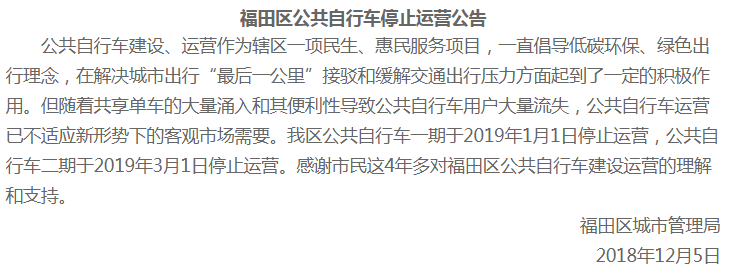 2019年起,福田區(qū)公共自行車將停運(yùn)