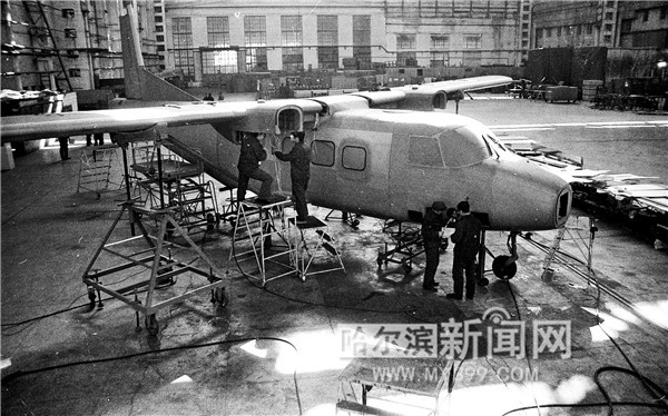 哈爾濱飛機(jī)制造公司自行研制的運(yùn)12多用途民用飛機(jī)取得了國內(nèi)首份按國際規(guī)范研制的民用飛機(jī)“型號(hào)合格證”,圖為當(dāng)年的制造車間。