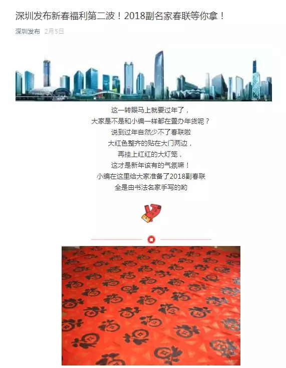 春節(jié)前后,許多人踏上回家路時。“深圳發(fā)布”的小編們在“送春聯(lián)”,春節(jié)當天還在推送信息。