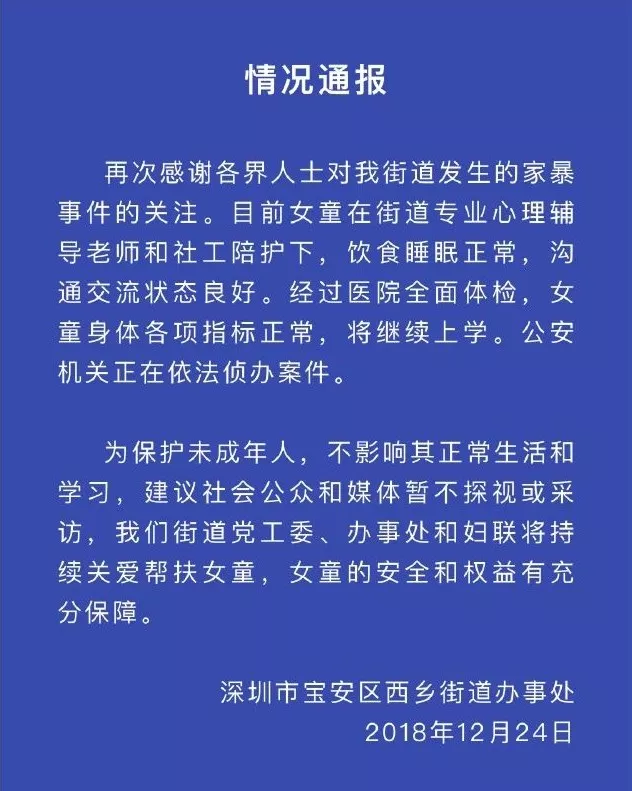 12月23日,深圳警方關(guān)注并調(diào)查此事。隨后深圳市寶安區(qū)委宣傳部官方微博@陽光寶安發(fā)布通報(bào)稱,女童父母對(duì)毆打女童的事實(shí)供認(rèn)不諱。寶安區(qū)婦聯(lián)已向法院申請(qǐng)女童人身安全保護(hù)令。